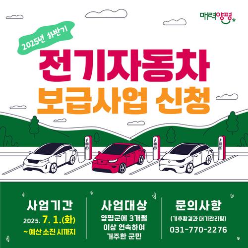 (양평=브레이크뉴스 경기동북부)하인규 기자=양평군(군수 전진선)은 무공해차 보급 확대를 통해 대기환경 개선에기여하고자 상반기에 이어 ‘2025년 하반기 전기자동차 보급사업’을 지난 7월 1일부터 본격적으로 실시한다고 밝혔다.
