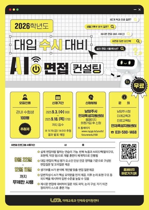 (Namyangju = Break News, Northeastern Gyeonggi Province) Namyangju City (Mayor Joo Kwang-deok) is recruiting participants for the "2026 College Admissions AI Interview Consulting" program for 100 students in the city from March 3rd to the 18th.