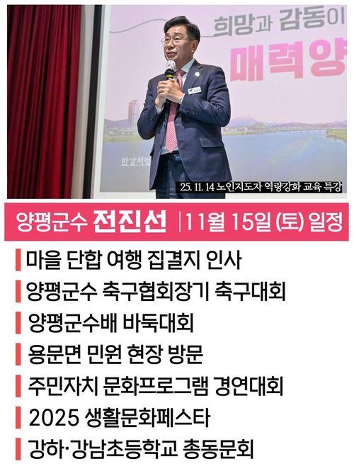 이날 전 군수는 마을 단합여행 집결지 인사를 시작으로 ▲양평군 축구협회장기 축구대회, ▲양평군수배 바둑대회, ▲용문면 민원 현장 방문, ▲주민자치 문화프로그램 경연대회, ▲2025 생활문화페스타, ▲강하·강남초등학교 총동문회 등 양평 곳곳의 주요 행사에 함께한다.